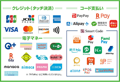 auPAY、メルペイ、ファミペイ、銀行Pay、ゆうちょPay、K PLUS、ANA Pay、pring、Payどん、ギフティプレモPlus、atone、EPOS PAY、Lu Vit Pay